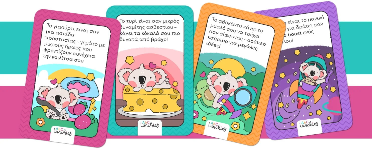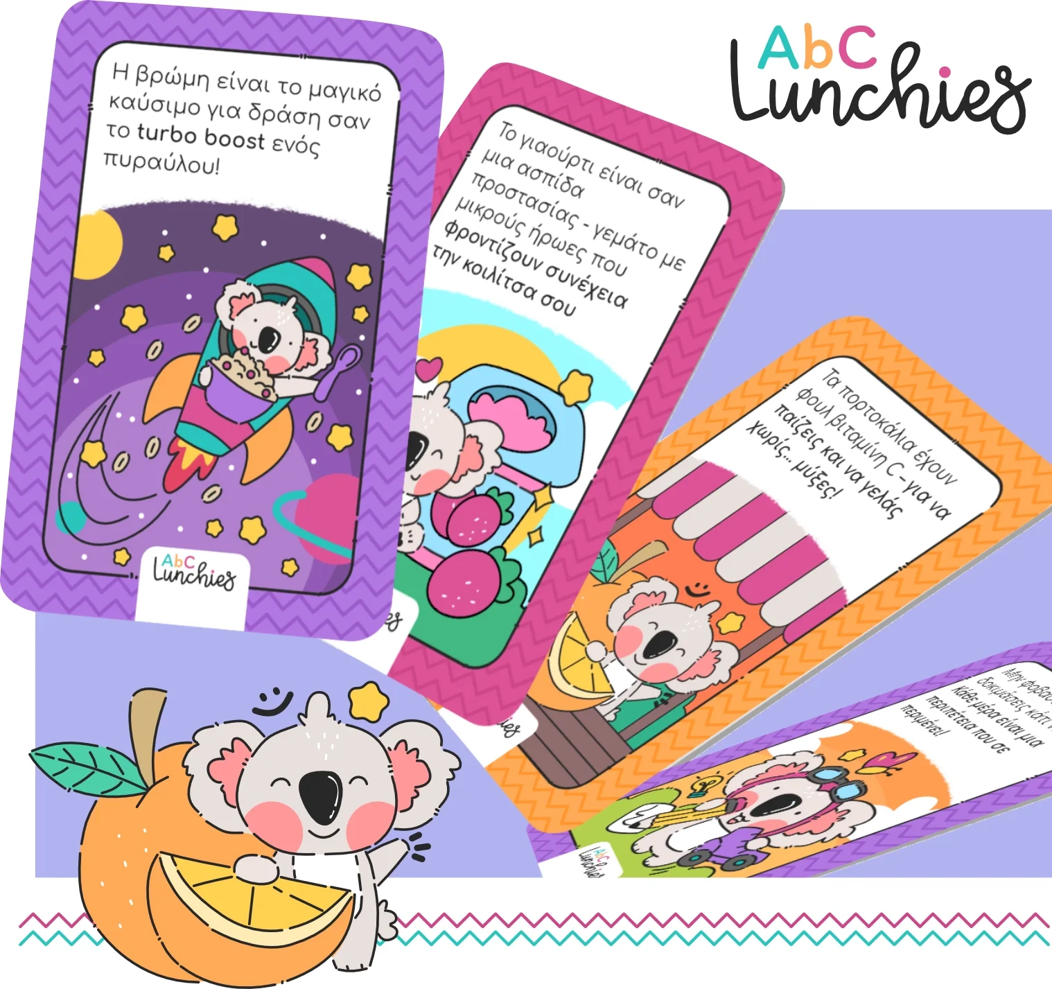 Inspired by a creative mom in Greece who turned snack time into playtime, ABC Lunchies brings fun to every bite. As the lead designer, I developed the full brand identity — from the playful koala mascot and card sets to the overall graphics and packaging — creating a cheerful world that makes even picky eaters excited to eat.
