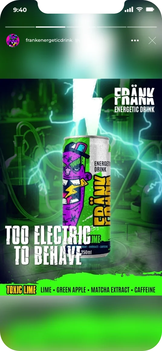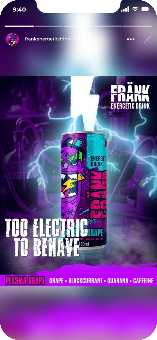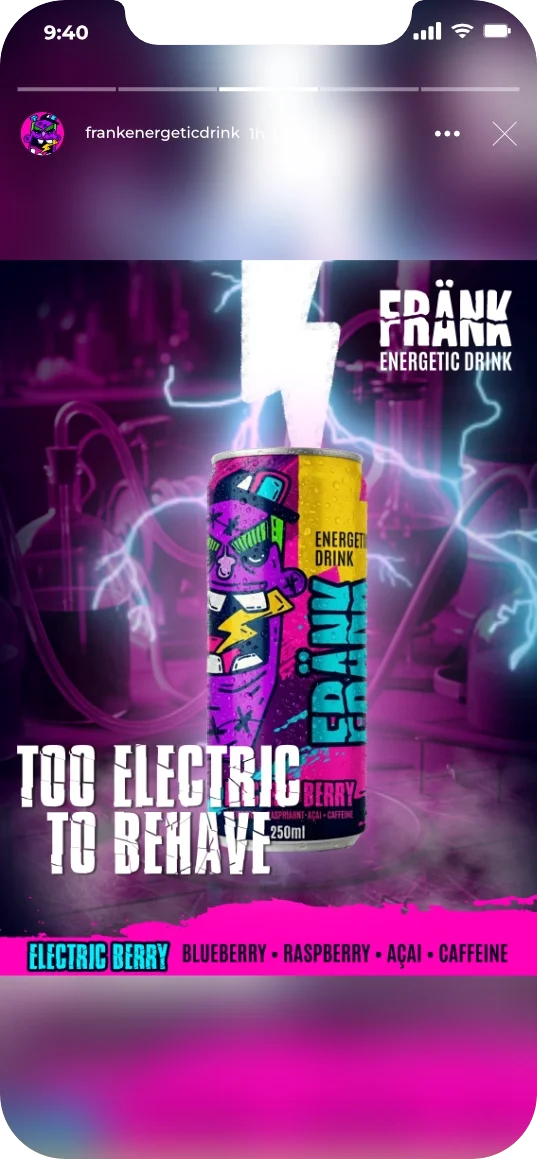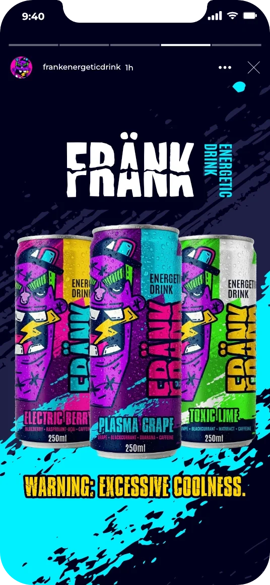 Through bold, graphic visuals inspired by street art, cartoons, and underground culture, Frank connects with young adults who express themselves through motion and attitude. The result is an immersive world that feels loud, artsy, and unapologetically alive — an energy drink that looks and feels as cool as the people who drink it.
