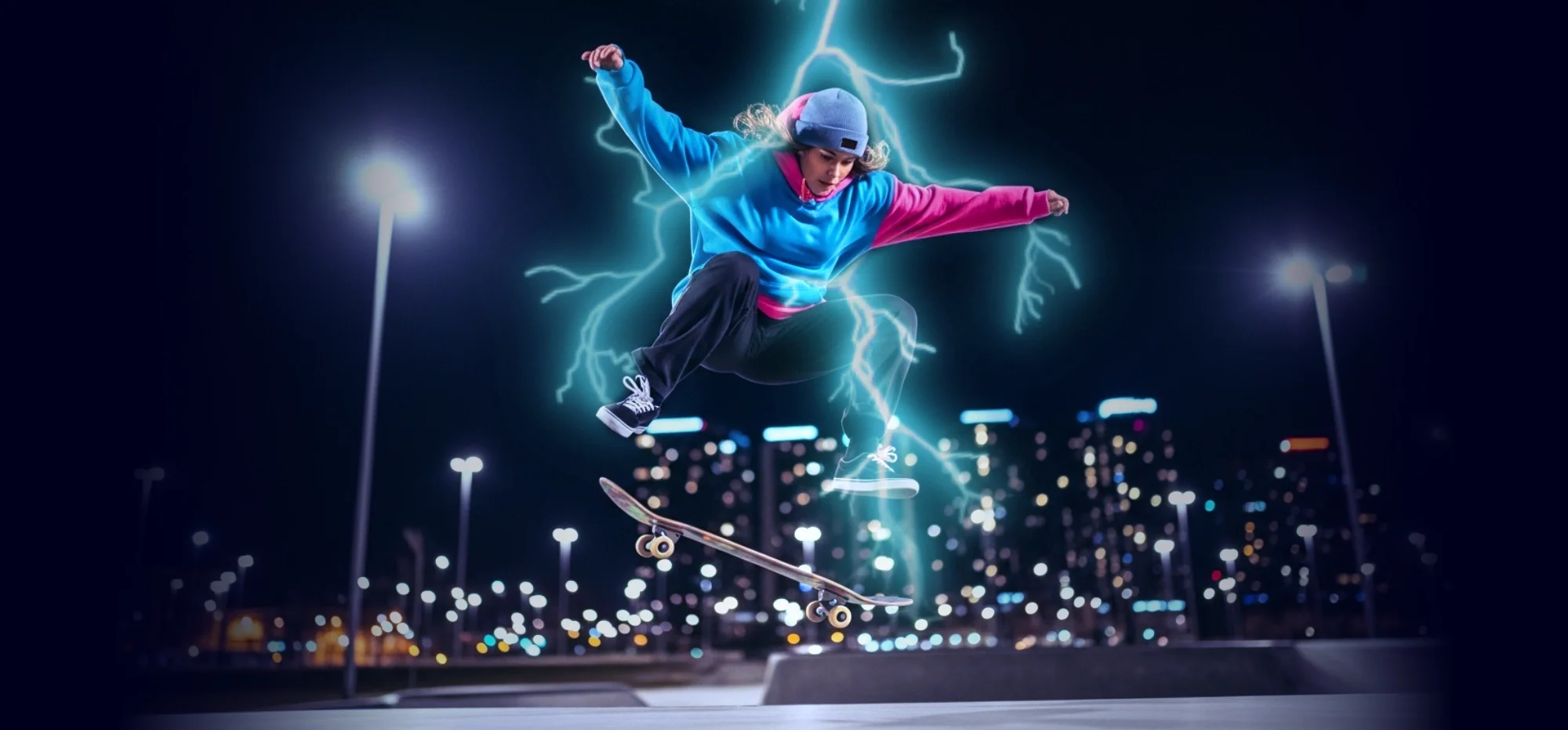 Electric purple, electric blue, neon pink, bold yellow, and neon green form a high-energy palette built to feel loud, playful, and disruptive. These colors reference electricity, speed, and street culture, echoing graffiti, cartoons, and radical sports visuals. Together, they express movement, irreverence, and creative chaos — translating raw energy into a bold, graphic language.