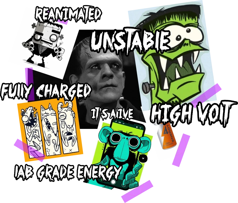 The visual references draw from Frankenstein by Mary Shelley, classic film interpretations, and bold illustration styles. The brand reinterprets the story’s core idea — creation through electricity — translating the lightning that brings Frankenstein to life into the energy contained inside the drink. Thunder, bolts, and electric tension become visual metaphors for activation, movement, and momentum, shaping a world where energy feels raw, graphic, and alive.